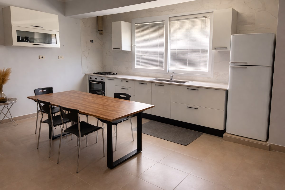 Appartement familial à Sayada, Monastir. Spacieux et idéalement situé, cet appartement à Sayada offre un cadre calme, parfait pour les familles. À proximité des plages publiques et privées ainsi que de nombreux restaurants, il dispose de 3 chambres :une master avec lit double et salle de bain privée, une deuxième chambre avec lit double et une troisième avec deux lits une place. Une seconde salle de bain est disponible. Profitez de cet emplacement pour des vacances reposantes près de la mer!