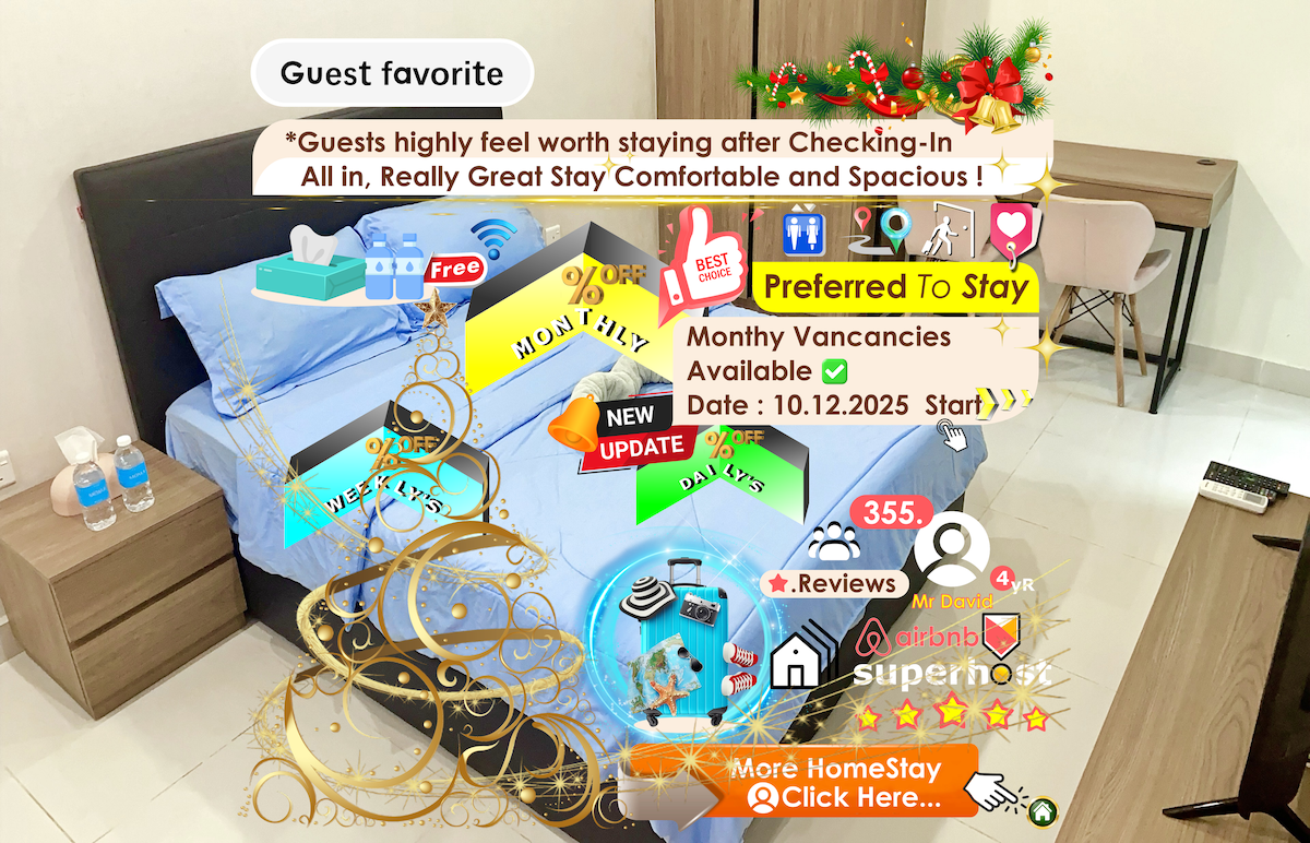 Armadale Residence Homestay 📍 Location: Gala City ✨ Unit Details: ▪️ 3 Bedrooms • 2 Bathrooms ▪️ Maximum 10 persons — suitable for family & group stays 🚗 Nearby Hotspots: ▪️ 5 mins ➜ Airport ✈️ • Premiere 101 (Local Delights & Food 🍜) • CityOne Megamall • Emporium (Food & Dessert 🍰) • Saradise (Restaurants • Bars 🍹 • Café ☕) ▪️ 8–10 mins ➜ Vivacity Megamall • Boulevard Shopping Mall • Aeon Shopping Mall • The Spring Shopping Mall