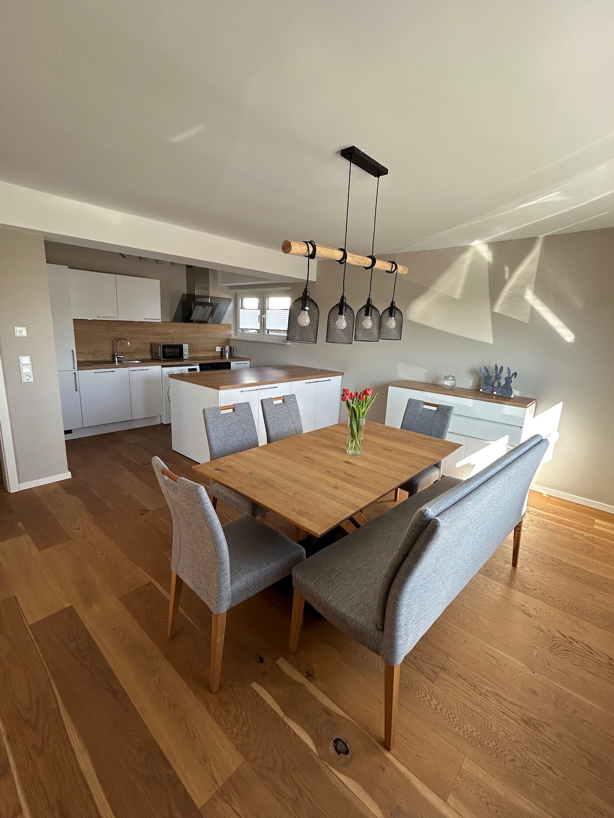 This comfortable 108m² ground-floor apartment (barrier-free) boasts a charming village-like location on the outskirts of town,with easy access to the baroque city of Fulda and the nearby Rhön region. In addition to two bedrooms and a children's room,the apartment features two bathrooms.The spacious living room,equipped with a 55-inch smart TV,open-plan dining area and fully equipped kitchen,is sure to impress.The cozy ambiance of a wood-burning stove and a bathtub invite you to relax and unwind.
