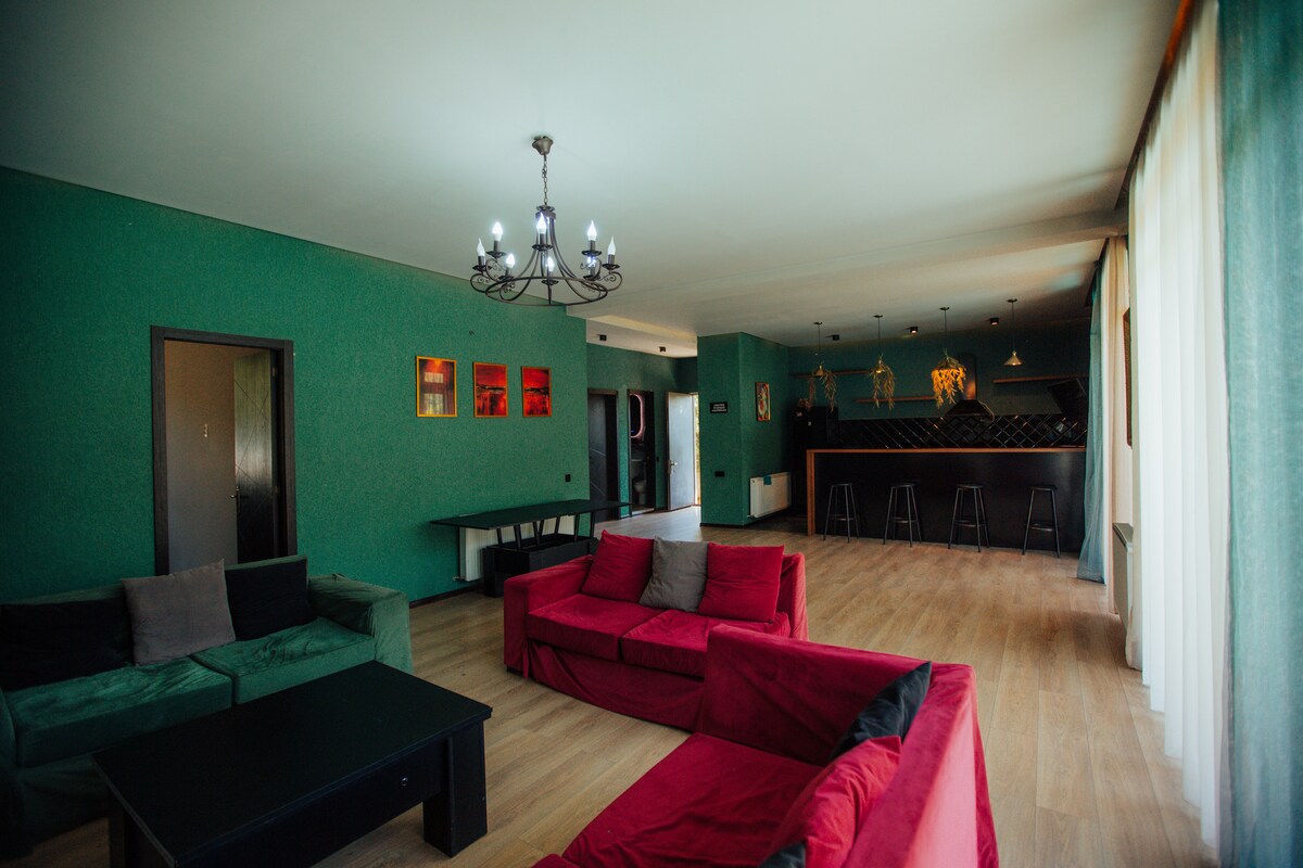 Villa de grande classe dans la région de Shindisi-Tabakhmela. À seulement 5 min en voiture du parc Mtatsminda et à 10 min en voiture de la place de la Liberté - Centre-ville de Tbilissi. La villa est conçue dans un style vintage, avec des éléments baroques, des lits de style français, une cave à vin unique avec cheminée et cuisine . Nous proposons 3 chambres avec un lit king size , 3 chambres avec lits Quinn et 1 chambre avec 2 lits simple. sur ces 7 chambres, 3 de classe VIP. 6 d'entre elles ont la climatisation dans la chambre et ont leurs propres balcons avec une vue imprenable