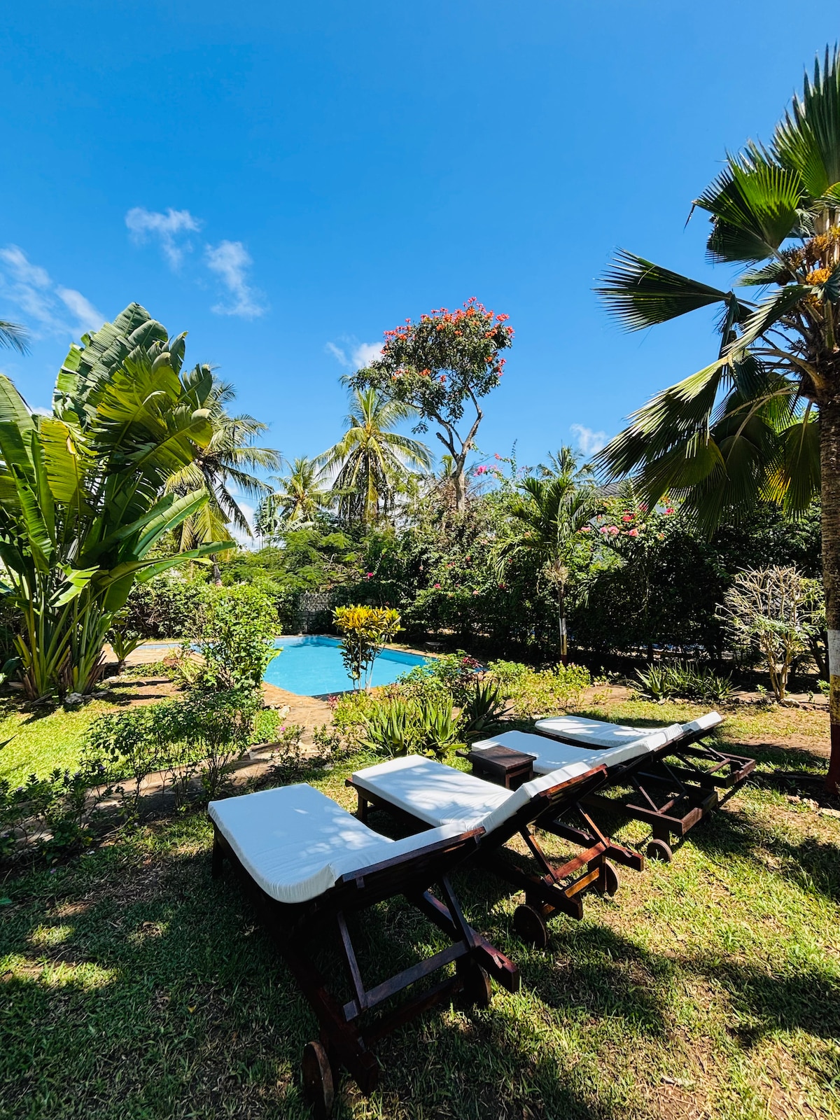 Détendez-vous dans cette maison calme, privée et élégante. Villa Lazizi Diani Beach - Calme, tranquille et proche des commerces, des restaurants et des divertissements. Un magnifique jardin tropical et une promenade confortable de 350 m jusqu'à la meilleure plage de sable blanc d'Afrique et élue 5e meilleure plage de sable blanc au monde. Ou plongez dans la grande piscine bleue privée. 2 grandes chambres climatisées avec salle de bains privative. Internet par fibre optique, une cuisine entièrement équipée avec des équipements européens dans toute la maison.