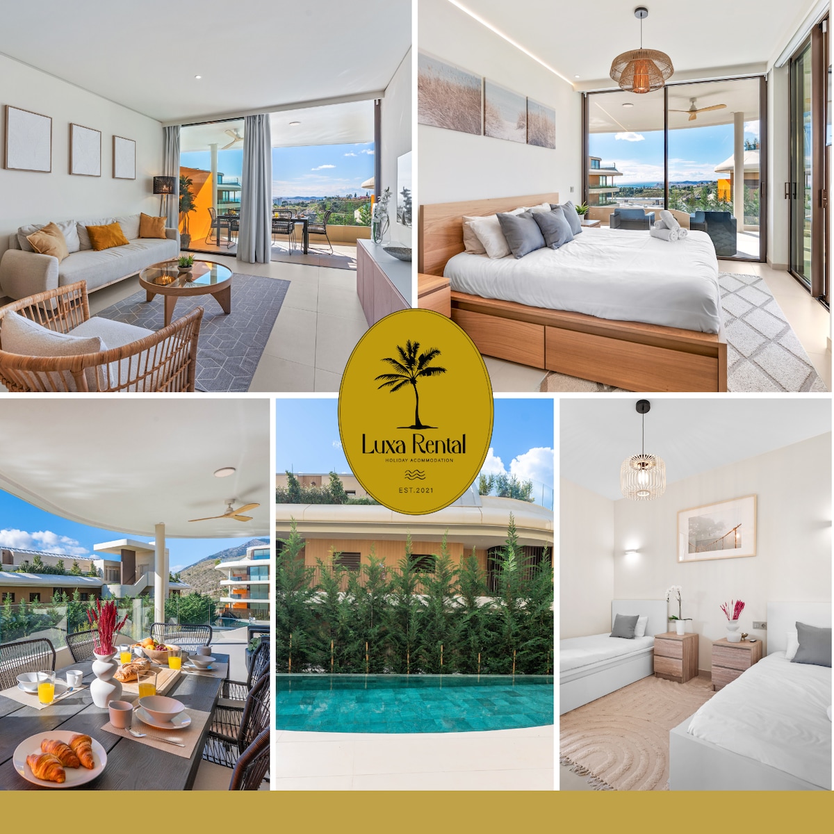 Exclusif rez-de-chaussée à Higuerón avec grand jardin et jacuzzi privé à 38-40 °C. Il dispose de 2 chambres, 1 salle de bain moderne, cuisine entièrement équipée et salon avec Smart TV Climatisation centrale, WiFi haut débit, parking privé et accès à 3 piscines communautaires. Situé près de la plage de Carvajal, avec spa, salle de sport et restaurants dans le resort Higuerón. Parfait pour profiter de l'intimité, du confort et du luxe sur la Costa del Sol.