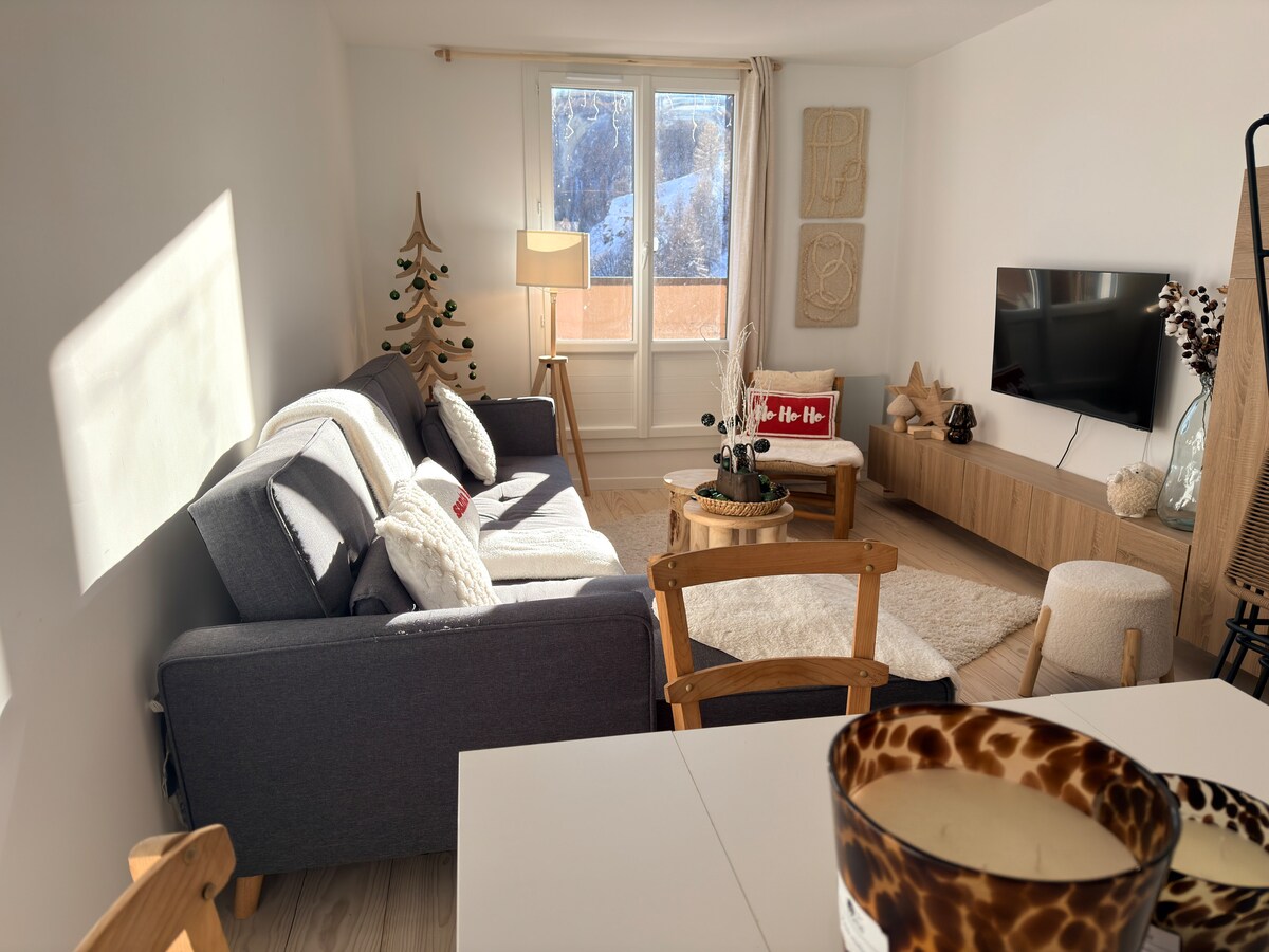 Studio spacieux , tout confort , complètement rénové, de 38 m2 avec terrasse loggia de 8 m2 ; Magnifique vue sur la montagne . Parking privé ; WIFI ; calme. Cuisine entièrement équipée ;Frigo congélateur, lave-vaisselle, plaque induction, four multifonctions, cafetière , grill-pain, appareils à raclette et à fondue; TV connectée. Coin montagne ; WC séparé. Grande terrasse loggia expo sud-ouest avec table, chaises, fauteuil relaxation, vue super. Quartier Etoiles 1800 m; au départ des pistes !