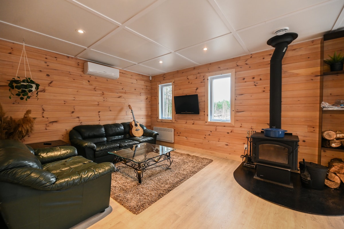 Bienvenue à La Khabine ! Ce chalet confortable et moderne est équipé de tout ce dont vous avez besoin pour vous détendre et vous connecter avec la nature. Dégustez un verre de vin au son d'un feu crépitant dans la cheminée à bois. Admirez la vue sur la forêt à travers les baies vitrées environnantes. Détendez-vous dans le sauna extérieur privé en baril de cèdre. Les produits de soins naturels, le bois de chauffage, le savon à linge et le Wi-Fi haut débit sont tous gratuits. Nous espérons que vous aimerez notre petite cabane de fenêtres autant que nous :)