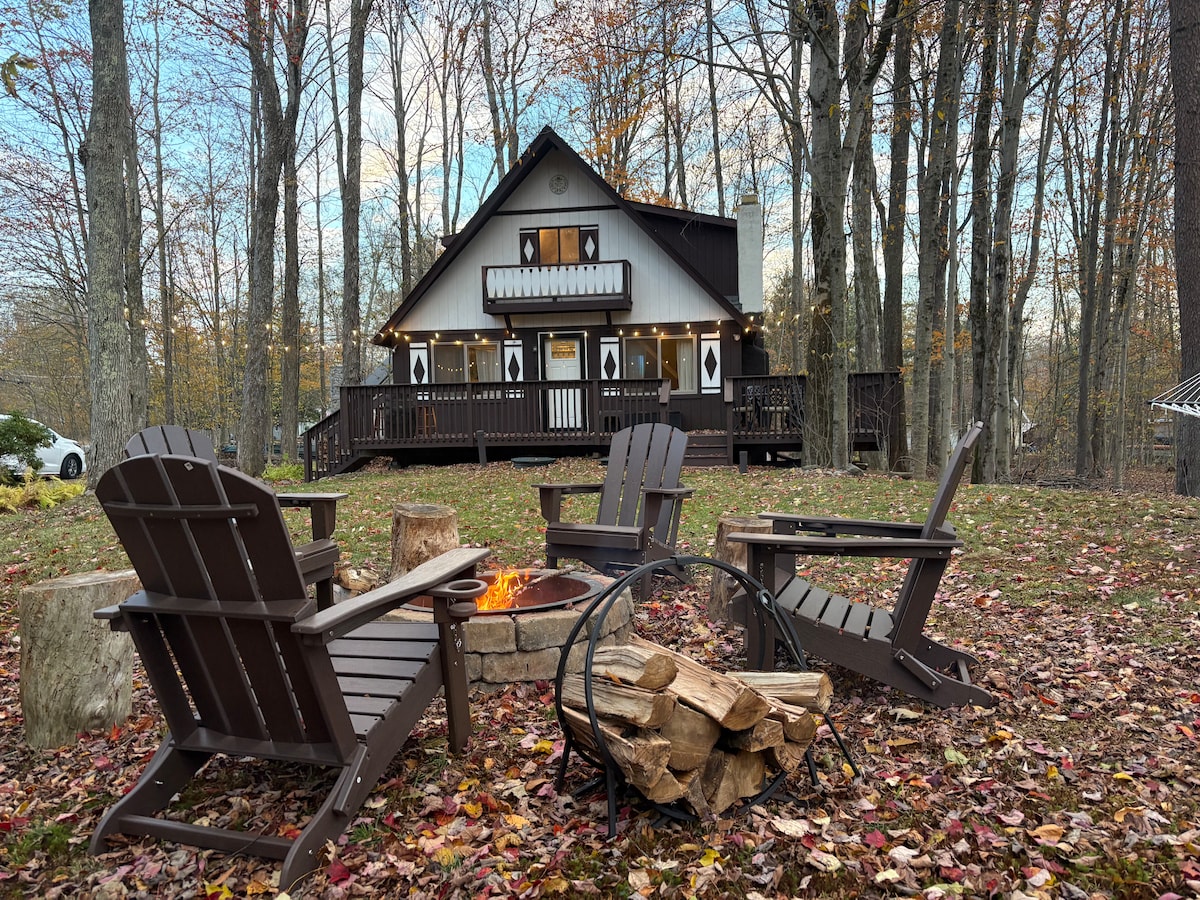 ESCAPADE D'AUTOMNE🍁 dans les Poconos⛰️ Proche des sentiers de randonnée, des stations de ski, des parcs aquatiques intérieurs, des casinos, des magasins d'usine et plus encore ! Approuvé par Paw 🐾 Animaux acceptés ! Chalet de charme 3 chambres/2 salles de bain avec tout le confort moderne ! Séjour ouvert avec cheminée confortable !🔥Terrasse, table de feu et grill pour profiter du plein air ! Faites des S'mores autour du foyer ! Situé dans le complexe sécurisé de Big Bass Lake, rempli d'équipements ! C'est l'escapade parfaite pour un week-end romantique, quelques amis qui veulent explorer les Poconos ou des vacances en famille !