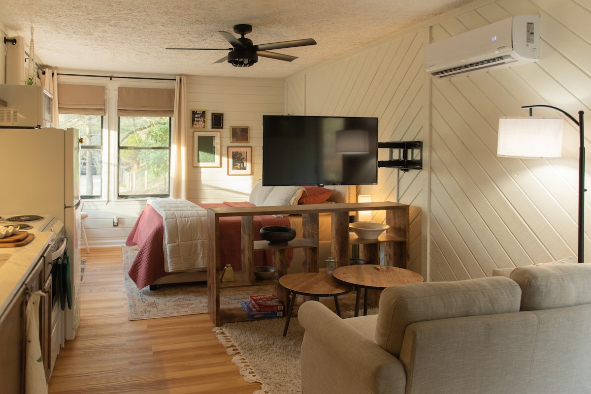 Ce « petit appartement » rustique est le secret que vous ne sauriez même pas qu'il était là (appartement au sous-sol). Avec une cuisine, une salle de bain complète, un lit queen size et un canapé convertible, c'est tout ce que vous pouvez espérer d'un petit espace de vie ! Nous avons plusieurs livres et jeux de société pour profiter de votre temps ensemble et l'écran plat de 50" est là, juste au cas où la lecture et les jeux ne seraient pas votre truc. Si vous avez besoin d'un endroit calme pour vous évader pendant un certain temps, ou d'un endroit propre où poser votre tête, nous sommes là pour vous aider !