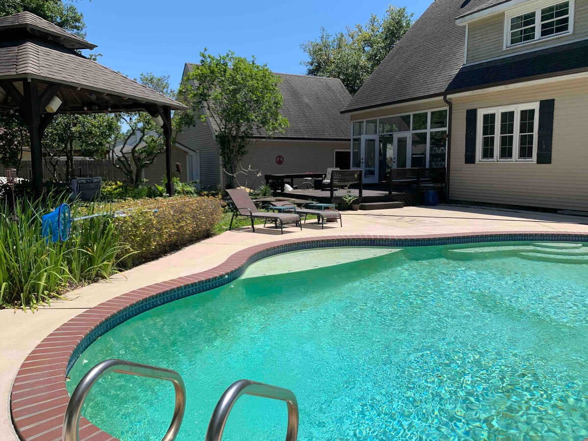 This charming pool house has doors that open up to a poolside view. It has a full kitchen, washer/dryer, bathroom and a second floor that boasts a pool table and a balcony view of the pool! Sleeps 4. Downstairs sleeps 2 memory foam fold out sofa bed . Checkin time is 3:00pm and checkout is 10:00 am. We do allow lenient times upon request. Brand new memory foam mattresses on queen bed and queen foldout sofa