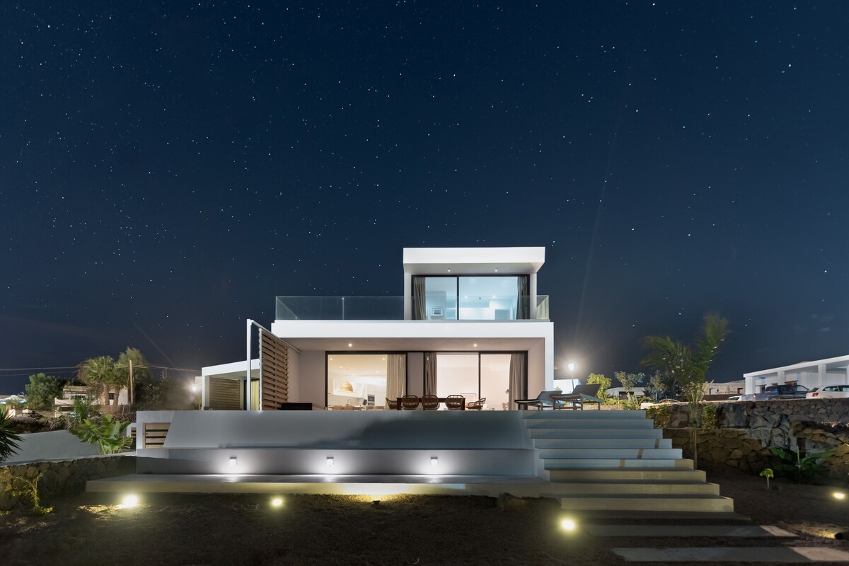 Vues panoramiques sur 10 volcans. Vous pourrez contempler les étoiles et profiter des levers de soleil et de lune. Dans un havre de paix pour le silence dont on jouit. Villa aux finitions récentes avec équipement haut de gamme dans les chambres et la cuisine. Quartier résidentiel. Proximité des plages. Entourée de parcs. naturel Lajares est un village authentique avec beaucoup de vie. Marché artisanal, boulangerie française, restaurant avec musique live et supermarché dans le village.