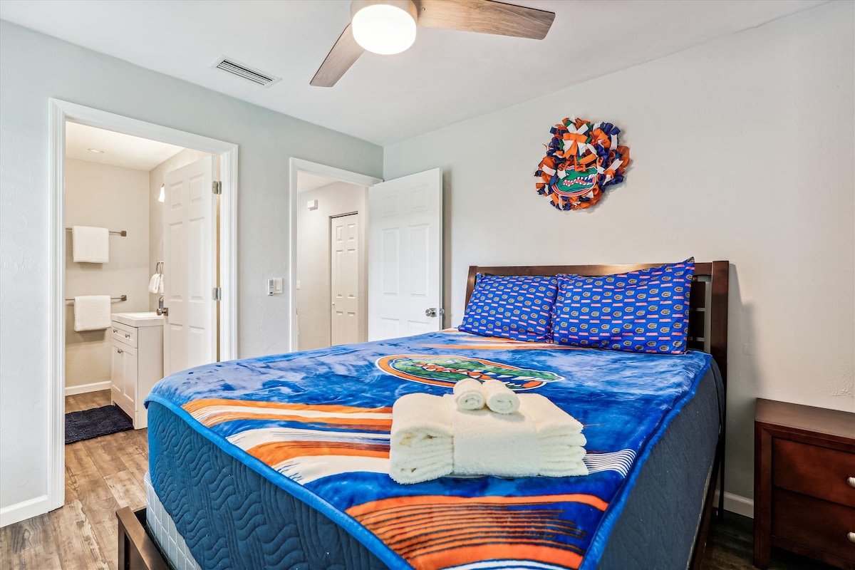 Cette suite se trouve à un peu plus d'un mile du campus de l'Université de Floride ainsi que du centre-ville. Shands et les hôpitaux VA sont situés à environ 2 miles. Le logement vient d'être entièrement rénové et offre une chambre privée, une salle de bain, une entrée pour les invités, la climatisation et un parking. L'appartement est situé dans un quartier résidentiel paisible et est à proximité des épiceries, pharmacies et autres commodités locales.