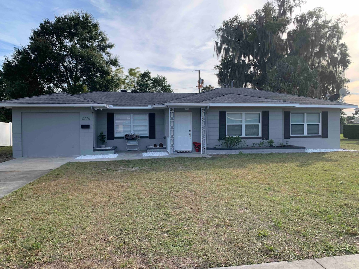 À distance de marche de tout ce que le centre-ville de Mount Dora a à offrir ! Notre charmant chalet des années 1940 de 2 chambres et 1 salle de bain a été récemment rénové. Comprend une cuisine entièrement équipée, une terrasse avec barbecue à gaz et un foyer extérieur. Espace de vie confortable et élégant avec télévision connectée de 65 pouces. La chambre principale dispose d'un lit King Size et d'une télévision connectée. La deuxième chambre dispose de deux lits jumeaux confortables. Vélos disponibles. Que vous veniez vous détendre, faire du bateau, faire du shopping ou participer à l'une des nombreuses festivités de Mount Dora, envisagez de séjourner ici !