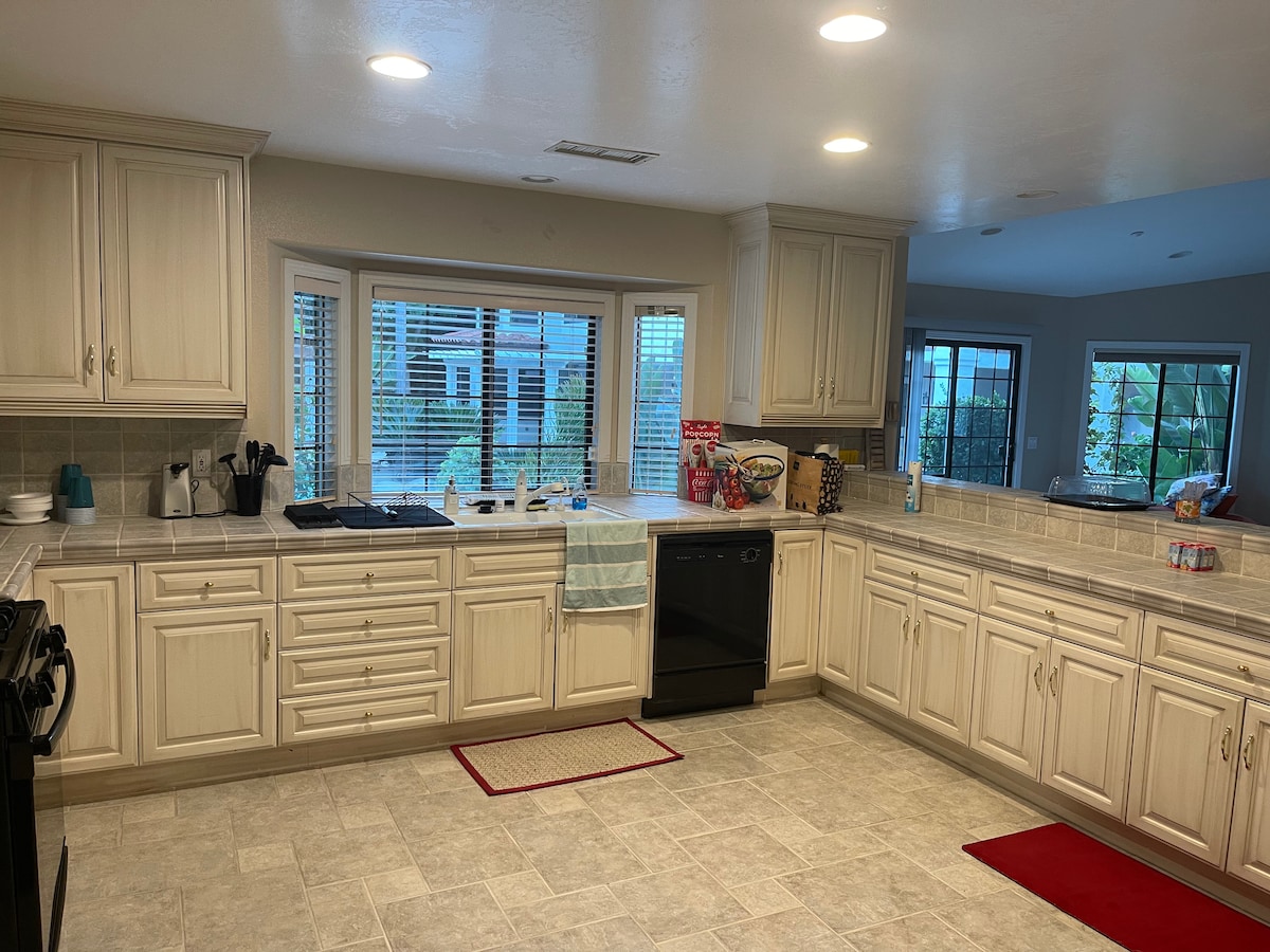 Notre maison de plain-pied dispose de 3 chambres, 2 salles de bain et un salon avec un plan d'étage ouvert. La superficie intérieure approximative est de 1 900 pieds carrés. Les invités peuvent se garer sur la longue allée, ce qui est très pratique. Nous fournissons presque tout ce dont vous pourriez avoir besoin pour que vous puissiez voyager avec moins de soucis. Proche du centre-ville de Riverside, de l'hôtel Mission Inn, de l'UCR, du RCC, du Fox Theater, du NOS, de l'aéroport d'Ontario, d'Ontario Mills, de Crestmore Manor, etc. Les tarifs indiqués sont pour 4 personnes. Pour toute personne supplémentaire, il y aura des frais supplémentaires.