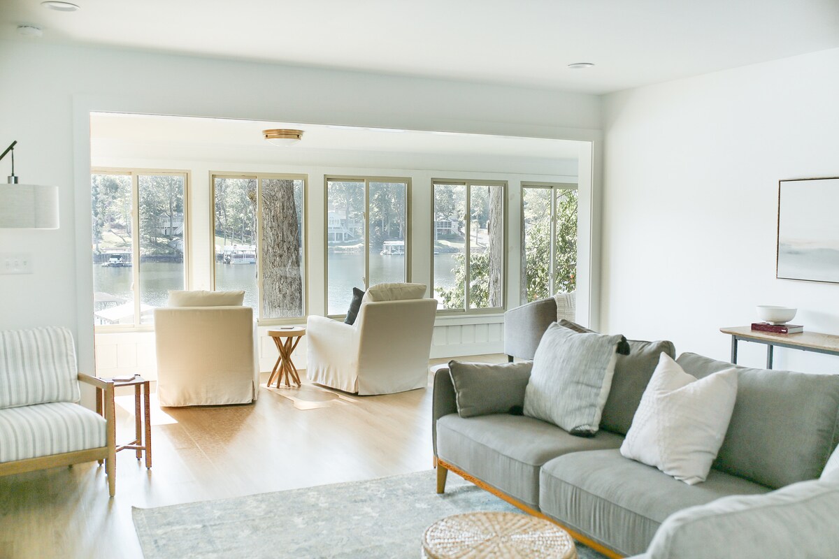 Maison moderne et chic au bord du lac dans une crique calme sur le lac Norman avec une vue magnifique. Profitez de cette retraite de luxe avec vos amis et votre famille dans notre maison de style ranch bien aménagée qui se trouve sur plus de 120 pieds de rivage, directement sur l'eau, nichée dans une crique privée à couper le souffle. Conçu pour accueillir jusqu'à 10 personnes avec style. Vous choisissez, est-ce le jacuzzi, l'ensemble de salle à manger extérieur qui peut accueillir 10 personnes sur la terrasse donnant sur le lac, les kayaks, les planches de paddle ou le foyer pour des s'mores sur la plage ?