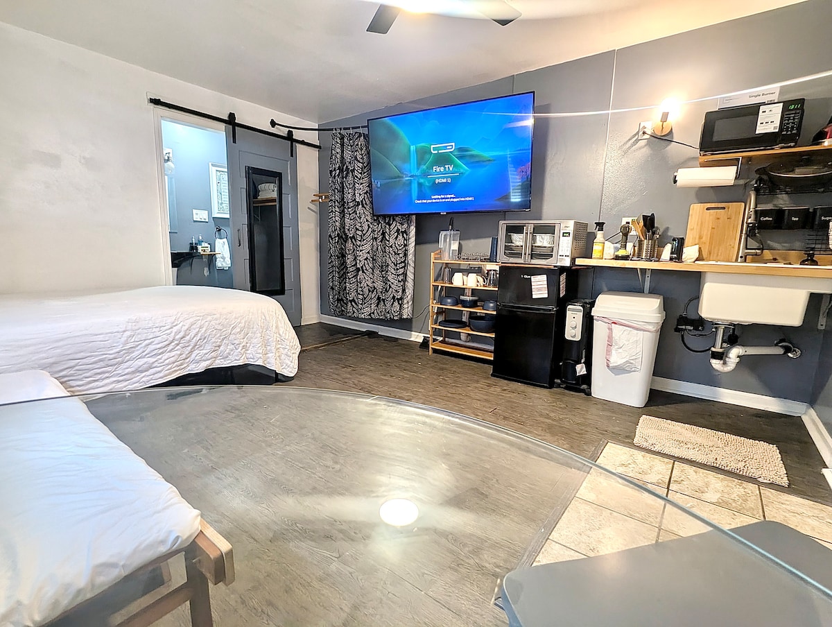 La chambre de Clementine est un charmant refuge à Mid City sur Bayou St. John. Il s'agit simplement d'une chambre/salle de bain avec douche carrelée, lave-linge/sèche-linge et lit king size. La porte est à côté d'un belvédère pour les moments en plein air et le bureau peut être arrangé pour 2 personnes pour dîner à l'intérieur. Il y a une grande télévision Roku pour regarder des émissions en streaming, un mini-réfrigérateur, un four à micro-ondes, une bouilloire électrique et un entonnoir à café pour préparer le café ou le thé du matin, ainsi que de la vaisselle et des couverts pour réchauffer une collation. En outre, elle peut être combinée avec notre Sweet Suite pour une réservation familiale de 2 chambres/2 salles de bain.