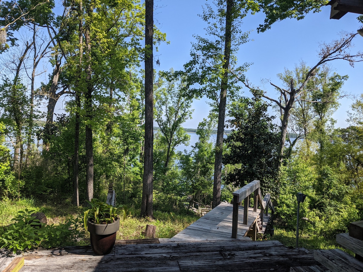 Profitez d'une belle escapade relaxante dans cette confortable cabane en rondins surplombant le lac Seminole. La maison est située sur un promontoire avec une vue imprenable sur l'eau, le porche arrière est l'endroit idéal pour s'asseoir et déguster un café le matin ou passer du temps avec des amis et de la famille après une belle journée sur l'eau. Le quai couvert est l'endroit idéal pour admirer un magnifique coucher de soleil en Géorgie du Sud. Avec suffisamment d'espace pour que les enfants puissent jouer dans le loft, c'est peut-être l'escapade idéale pour un week-end en famille.
