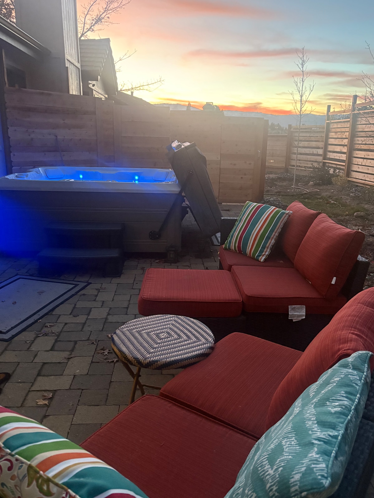 Unwind in a sparkling clean hot tub under the stars and relax on your own private patio. Hot tub is open year around but Patio and BBQ are not available in winter Dec-Mar due to snow. (Hot tub quiet hrs 10-8 No music in hot tub) This is a cozy, spotless, downstairs retreat (BOTTOM FLOOR OF OUR HOME) with private entrance. Next to miles of trails, 15 minutes away from Tahoe’s beaches and skiing. Curl up under a cozy down comforters and fall asleep listening to the wind in the pines.
