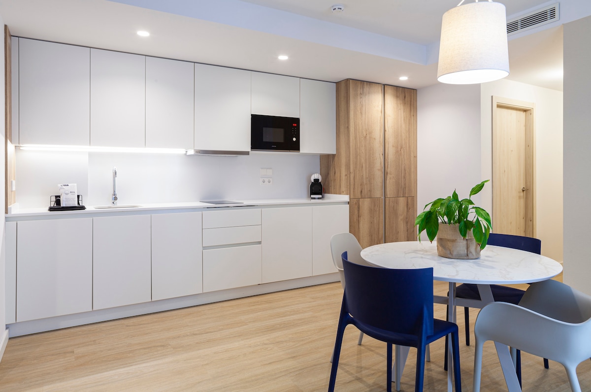 Appartement flambant neuf, entièrement rénové. Décoration élégante, murs en béton et peinture blanche lisse, armoires en fer avec des cristaux anciens, tables en bois anciens recyclées, canapés en lin, cuisine en microciment, avec lave-vaisselle, four, micro-ondes, lave-linge, sèche-linge... Lumière ambiante et chaleureuse