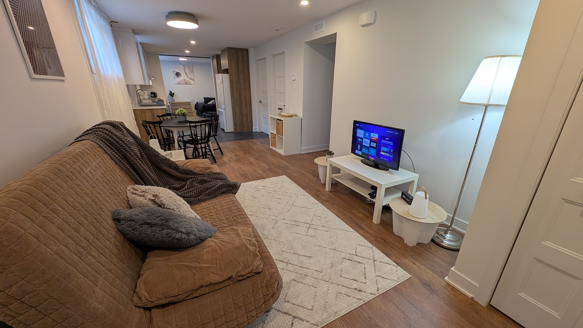 Sous-sol 4 1/2 entièrement équipé + solarium 1 chambre + cuisine + salon + salle de bain. Jacuzzi privé - Disponible 24h/24 et 7j/7 Bien qu'il s'agisse d'un sous-sol, il y a beaucoup de lumière du soleil qui entre. WIFI haut débit + télévision connectée Pour tous les batteurs/musiciens, il y a une batterie électrique gratuite ! Entrée privée et stationnement gratuit dans l'allée. Nous fournissons de l'eau en bouteille, du café moulu, du thé et des collations gratuits. Nous n'autorisons PAS les fêtes/événements/rassemblements.