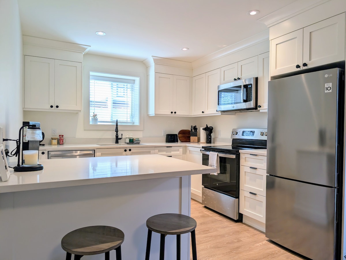 Découvrez notre charmante suite au rez-de-chaussée près du fort historique de Langley. Tout neuf, peut accueillir 6 personnes avec 2 lits Queen Size et un canapé-lit. Profitez de 3 téléviseurs intelligents, d'un plancher de salle de bain chauffé, d'une entrée privée et d'une cour fermée. Arrivée/départ sans contact, Wi-Fi, parking. Les voyageurs apprécient l'emplacement privilégié, l'accès facile aux transports en commun et les attractions de Fort Langley. Séjournez chez nous pour une escapade merveilleuse !