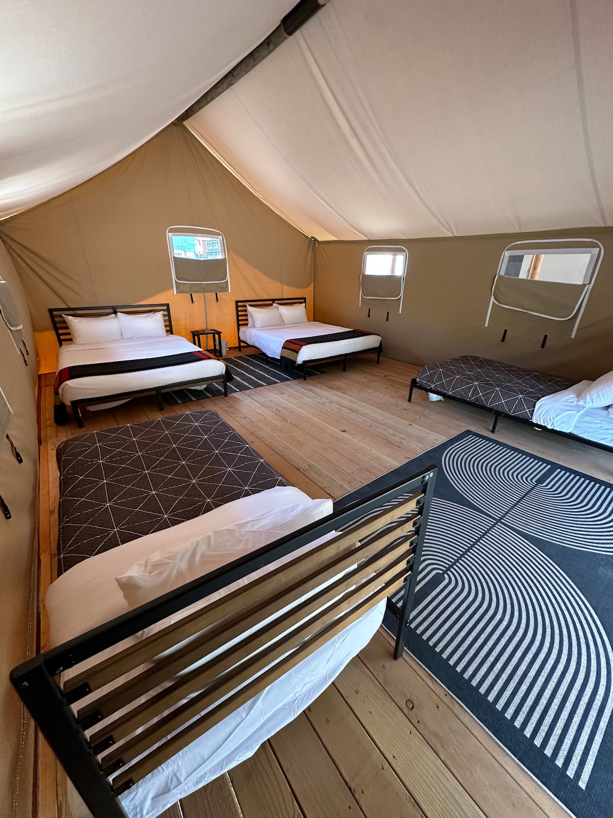Éloignez-vous de tout en profitant du chant de la rivière Poudre. Cette tente en toile est située au bord de la rivière et offre beaucoup d'espace pour vous étirer. Mule Deer dispose d'un lit queen size et de deux lits jumeaux entièrement équipés et de meubles de patio à l'intérieur et à l'extérieur de la tente. C'est une façon épique de se plonger dans la nature.