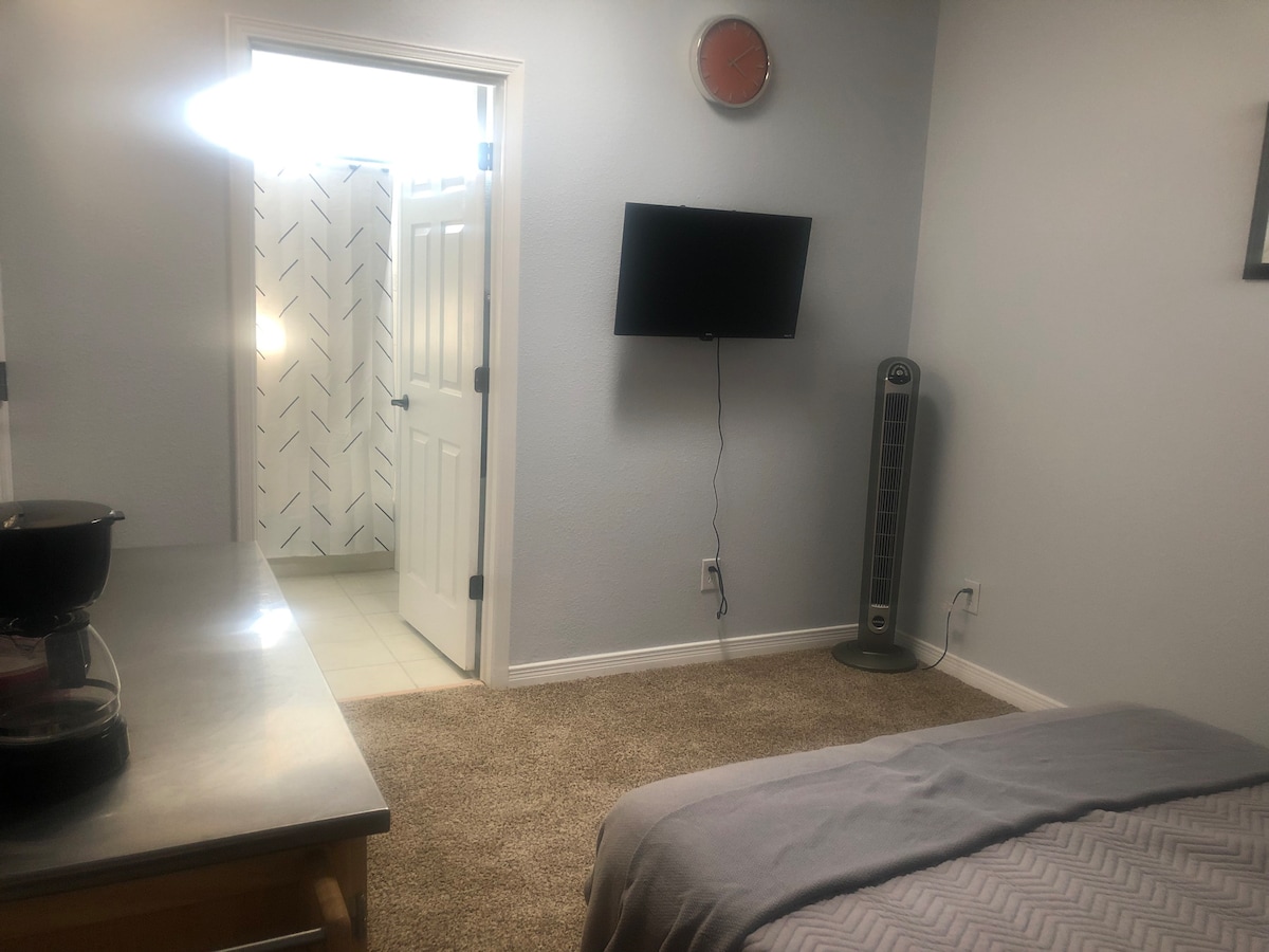 Profitez du NM ensoleillé dans une maison loin de chez soi. Studio récemment rénové et entièrement meublé avec nouvelle cuisine, salle de bain, appareils électroménagers et équipements. Près de Telshor & Lohman, <5 min de l'I-25, <10 min de l'I-10, NMSU, centre-ville, parcours de golf, parcs de balle et hôpitaux en ville. Ce studio dispose d'un lit King Size. Le divan se transforme en grand lit. Cuisine entièrement équipée avec lave-vaisselle, cuisinière à gaz, réfrigérateur, laveuse/sécheuse, air réfrigéré, chauffage, télévision 65"et Wi-Fi. Stationnement pour les résidents situés sur la propriété.