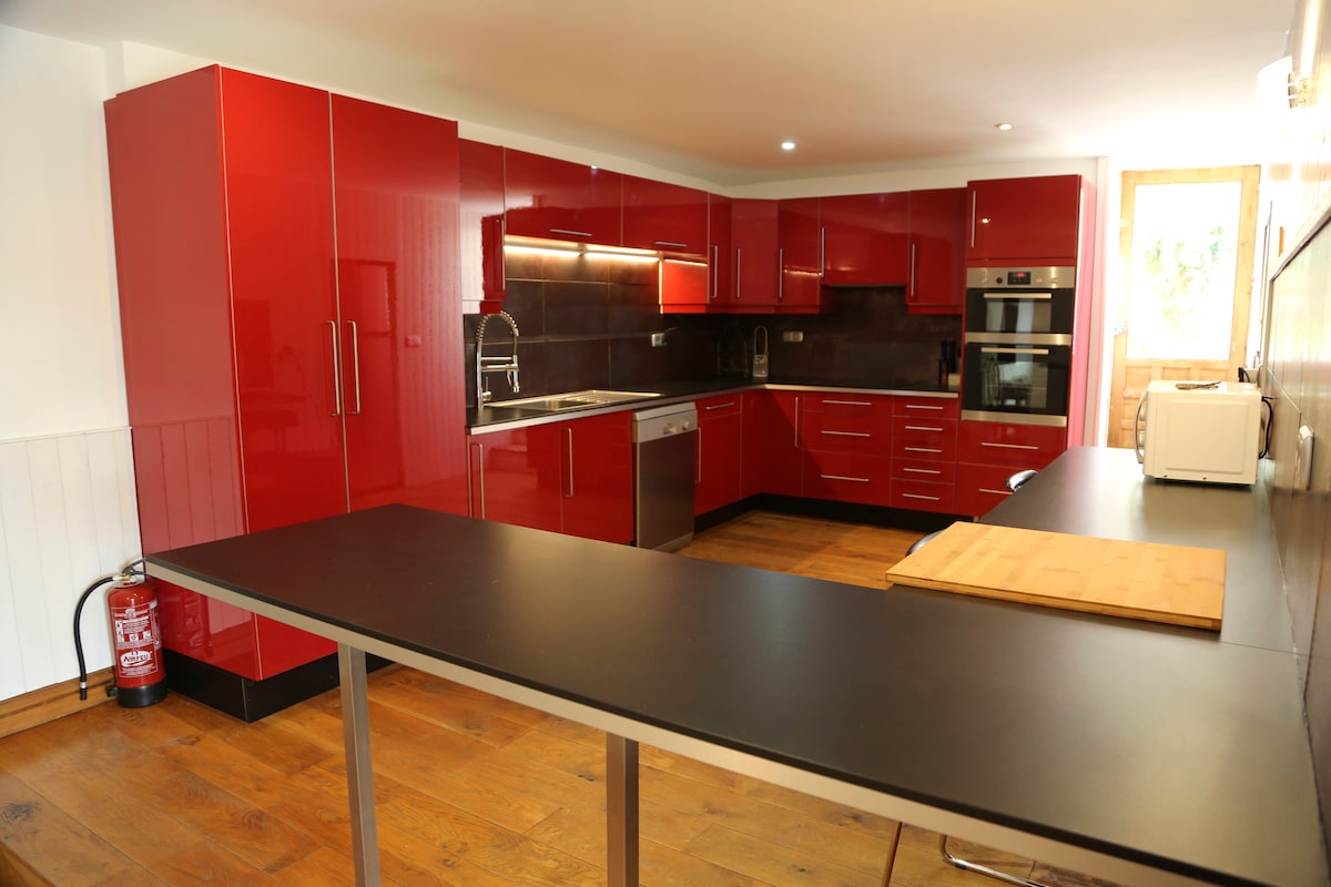 La décoration est très actuelle, gaie et lumineuse. C'est un loft moderne, très bien équipé, avec un garage à l'étage inférieur. Il se compose d'un salon-cuisine, d'une toilette, d'une chambre, d'une buanderie, d'une terrasse et d'un parking. Idéal pour le travail, avec wifi, et grand bureau.