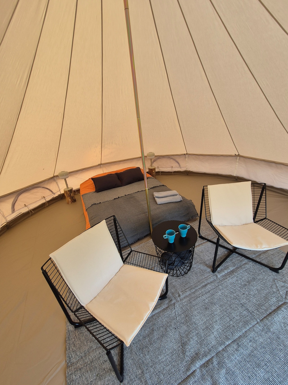 Vous voulez regarder les étoiles en dormant dans une tente ? Tout ce dont vous avez besoin est sur place : couvertures, oreillers, couvertures, serviettes, électricité, éclairage, votre propre terrasse. Kitchenette et salle de bain juste à côté dans un immeuble partagé.