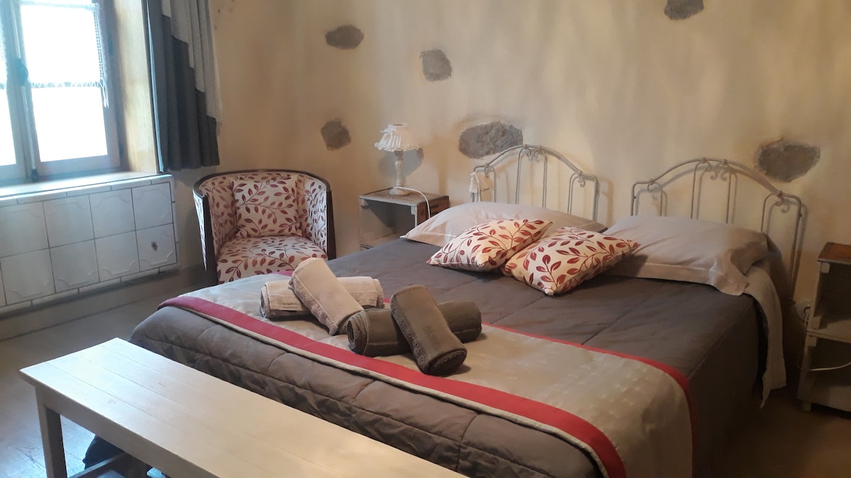 Nous mettons à disposition 1 ou 2 chambres avec lit king size 160/200, salle de bain et WC privés à l'étage de la maison . Le prix sur le calendrier est fixé pour une chambre, si vous n'êtes que 2 mais souhaitez la deuxième alors faites une réservation pour 3 personnes. Serviettes de toilettes et draps fournis. Parking privé dans notre cours où vous vous garerez en arrivant comme indiqué sur la photo. Possibilité de mettre des vélos ou moto dans le garage. Petits déjeuners possibles en sus.