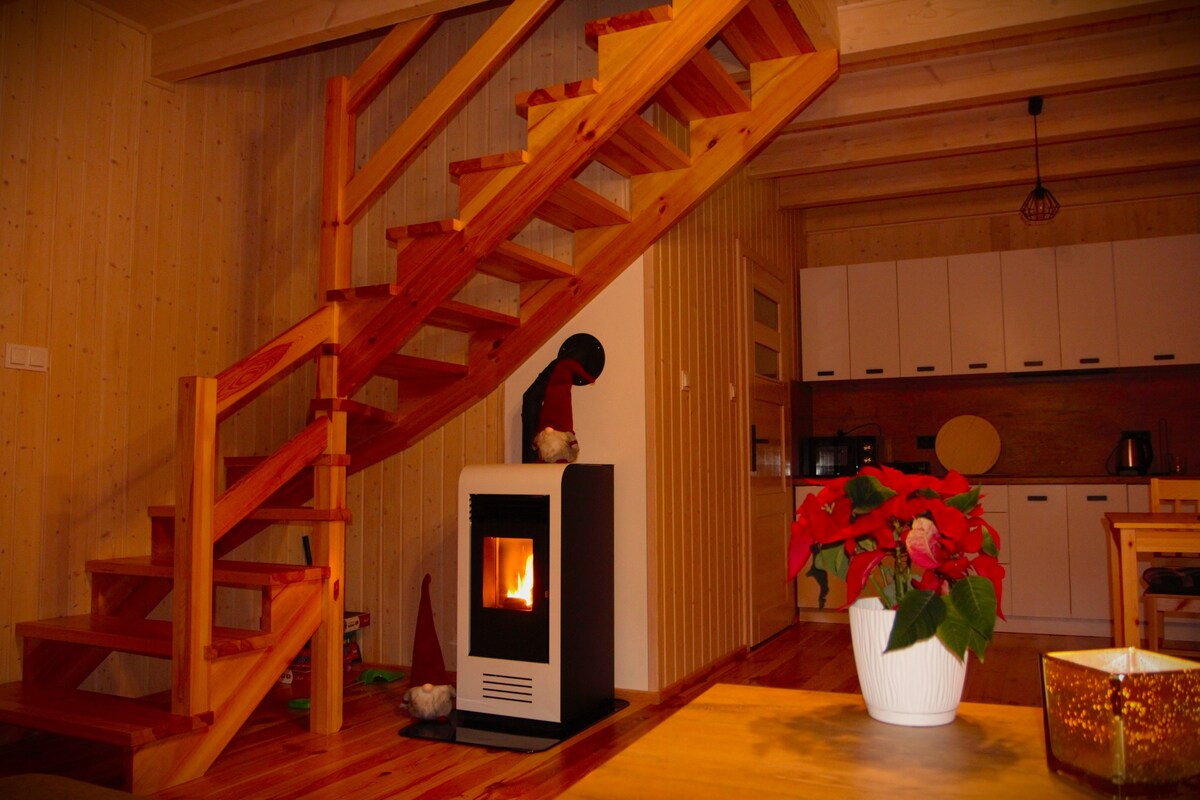 Je vous invite dans un chalet calme, situé dans le charmant village de Wdzydze (Kiszewskie). Si vous aimez la nature, si vous cherchez des moments pour vos propres pensées, ce sera l'endroit pour vous :) La maison se compose des pièces suivantes : rez-de-chaussée - salon avec coin cuisine, salle de bains. Premier étage - 2 petites chambres (la première avec deux lits simples, la seconde avec un lit double et un lit simple). En cas de froid, la cabane peut être chauffée avec un poêle situé dans le salon :)