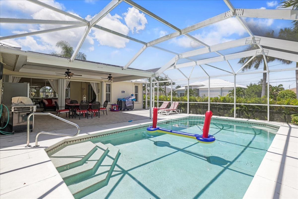 Villa Salt & Sol, an elegant, Coastal retreat in the yachting community of Cape Harbour, Cape Coral. Framed by stately royal palms - just 3 blocks from Camelot Park - Tennis/pickleball courts, playground/picnic areas, VILLA Salt & Sol blends upscale comfort w/coastal tranquility. • Gulf Access • 4 Kayaks • Dock w/13,000lb lift/Tiki Hut + glass bottom viewing area • Smart TVs in bdrms/2 liv rms/pool area • Beach/Fish Gear • Dog OK • Fenced yard • Free HTD Pool • Adults/Kids Bikes • Baby Gear