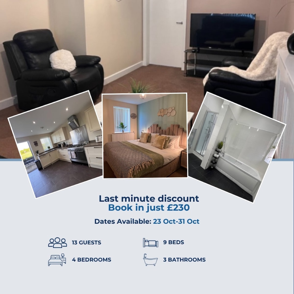 UNE GRANDE propriété dans le centre-ville ! Un Tardis certain ! Il y a un parking juste à l'extérieur de la propriété, une connexion wifi ultra-rapide et une télévision connectée. Cuisine entièrement équipée avec réfrigérateur-congélateur, lave-vaisselle et toutes les installations de cuisine dont vous avez besoin. Avec 3 chambres et 3 salles de bain, parfaite pour les entrepreneurs travaillant localement ou les amis/la famille qui cherchent à se réunir. Situé au centre-ville, vous trouverez une abondance de pubs, de restaurants et de plats à emporter à votre porte. PAS DE GROUPES DE MOINS DE 25 ANS