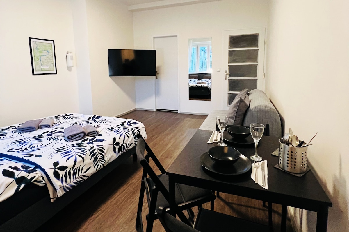 Nous proposons ce spacieux appartement boudoir/studio dans le centre de Prague. Le studio est composé d'une partie séparée avec un lit double (180x200), un coin cuisine, un coin repas et une salle de bains confortable avec douche. Les toilettes sont à l'extérieur dans le couloir/séparées de l'appartement/- mais pas partagées ! seulement pour nos voyageurs, pas pour quelqu'un d'autre.Tout neuf et fait avec une touche personnelle. L'appartement est situé à un carrefour animé.