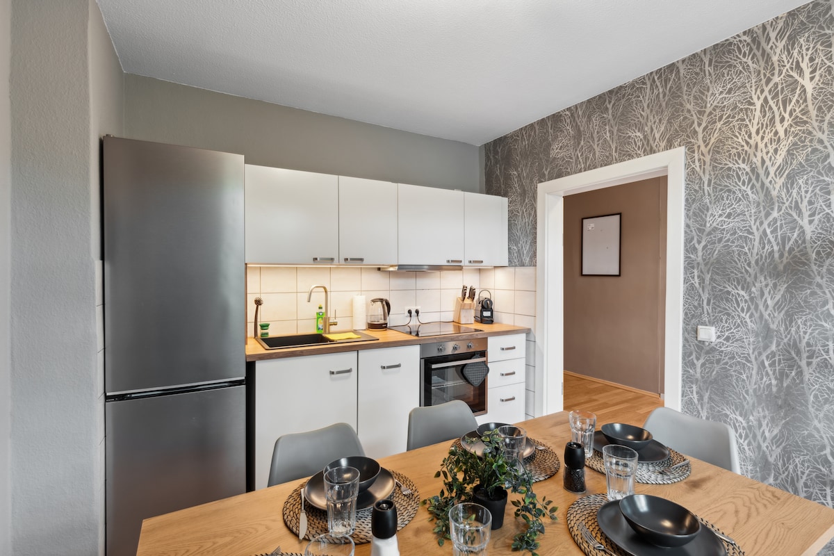 Bienvenue chez KERA Stay ! En plein cœur de Merseburg, directement sur le marché, un appartement élégamment meublé avec tout le confort pour le travail et le repos vous attend. Qu'il s'agisse d'un monteur, d'un voyageur d'affaires ou d'un vacancier – tu trouveras ici le mélange parfait de fonctionnalité, de confort et d'emplacement. Points forts : cuisine moderne, wifi rapide, lits confortables et tout à distance de marche – des restaurants au supermarché. Idéalement relié à Leuna, Halle, Leipzig et l'aéroport.