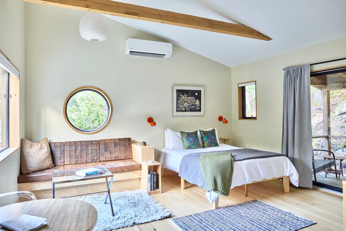 Présentée dans VOGUE et Maine Home + Design, cette cabane moderne et artisanale offre une vue apaisante sur l'Atlantique, 45 mètres de rivage et un ponton privé, parfait pour prendre son café le matin, faire du kayak ou observer les phoques, les oiseaux marins et les bateaux qui passent. Situé au milieu de grands pins, il allie influences nordiques et japonaises dans un espace calme et serein. Les intérieurs en bois, pierre, plâtre de chaux et béton forment une retraite ancrée, discrètement expressive et construite de manière durable. À 1 heure de Portland, mais un monde à part.