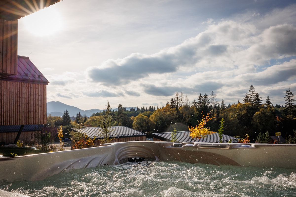 Cabane élégante en forme de A avec jacuzzi au bord du lac
