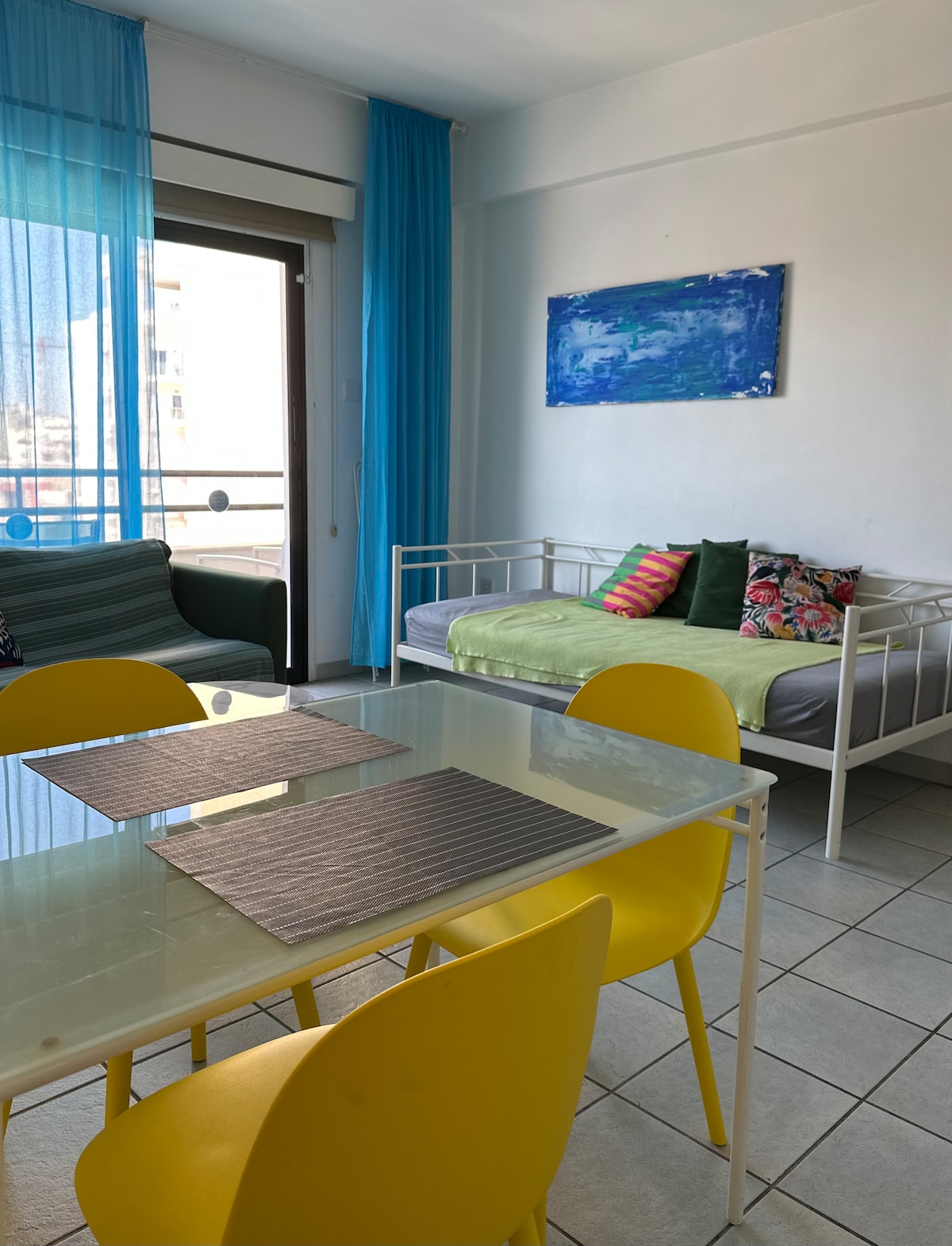 Tout mon appartement, se compose de : 1 séjour, 1 chambre, 1 salle de bain, 1 cuisine ; 1 balcon avant, idéal pour les couples, les aventuriers en solo, les voyageurs d'affaires. Les enfants de plus de 12 ans séjournent gratuitement. Accès : ascenseur et escaliers, pour les voyageurs à mobilité réduite. L'appartement fait 55 m². Vitesse Internet 150 Mbps. Petit déjeuner disponible dans des cafés de bon rapport qualité-prix à proximité et à 4 minutes à pied de la mer Méditerranée. Restaurants, vie nocturne et supérette à proximité. Départ : 12h00 - Arrivée : 15h00.