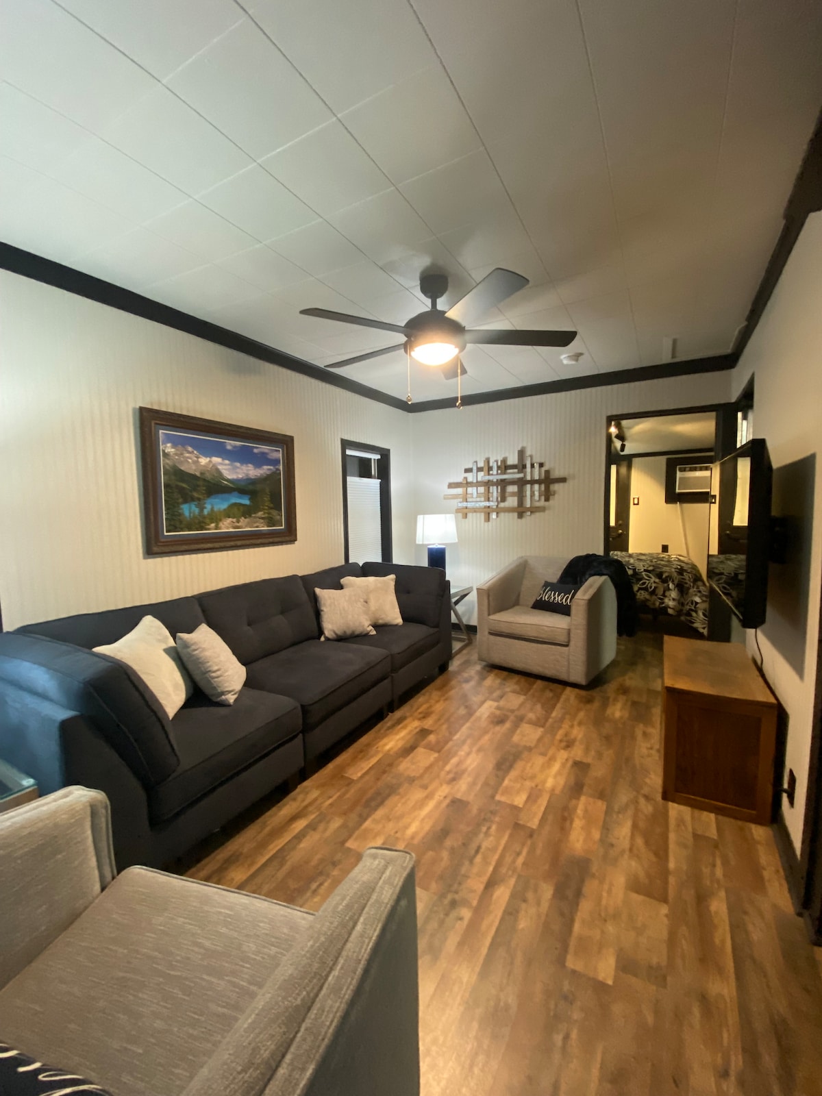 Il s'agit d'un appartement de 552 pieds carrés dans notre maison. Il dispose d'une allée et d'une entrée entièrement privées et d'une porte intérieure à verrouillage sécurisé entre les unités. L'une des caractéristiques qui, selon nous, vous plaira le plus est la douche spacieuse avec toute l'eau chaude que vous pourriez souhaiter ! La kitchenette est prête pour un peu de cuisine si vous le souhaitez. En plus du lit King Size, le canapé se replie dans un lit adapté à un enfant plus âgé ou à un jeune adulte, et un matelas double sur le sol est disponible sur demande.