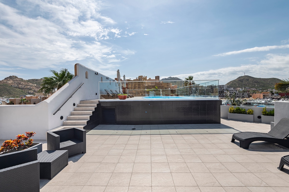Wake up and walk just 1 block to the Marina, Medano Beach & Puerto Paraiso mall, right in the heart of Cabo, yet tucked away for a peaceful stay. Unwind on the rooftop with stunning sunsets, a hammock, grill, and pool loungers ☀️ Comfortable King bed, Smart TV (Apple TV + Netflix), A/C, full marble bathroom, and a fully equipped space with everything you need. Perfect for couples or solo travelers looking for location, comfort & vibe. We’re ready to host you!