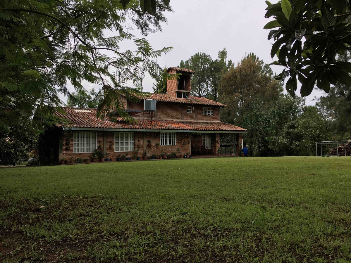 Profitez de la nature en famille ou entre amis dans notre cabane écologique, située dans le quartier Pinares Tapalpa - Plus de 1 500 m2 de surface entièrement clôturée. - Capacité d'accueil de 6 à 8 personnes (enfants compris) - Terrasse avec barbecue de style argentin, table avec 8 chaises et glacière. - Cuisine équipée avec réfrigérateur, gril, four, assiettes, verres et ustensiles de cuisine - Salle avec cheminée - 2 chambres, chacune avec 2 lits queen size. - 2 salles de bains complètes. - Wifi disponible.