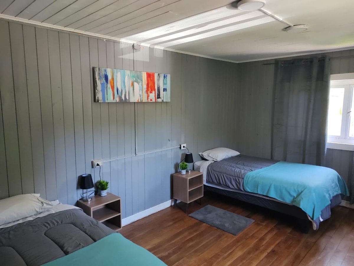 Chambre partagée spacieuse et confortable avec 4 lits et salles de bains partagées (en face de la chambre, séparées par un couloir). En plein centre de Futaleufu, à 5 minutes à pied de la lagune Espejo. 👉🏼 IG @mirlos.hostel