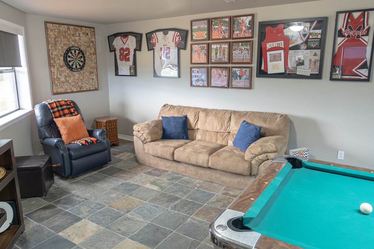 Escape to this beautiful retreat—perfect for family fun, group getaways, and work crews alike! This spacious 4-bedroom, 2-bath home offers comfort and entertainment at every turn. Enjoy a fully equipped kitchen and outdoor grill, plus an upstairs game room and a ping pong table for endless fun. Gather around the fire pit for stories or unwinding under the stars. Conveniently located near I-35, Lake Murray State Park, and local casinos. Ample parking for trailers. High Speed Internet!