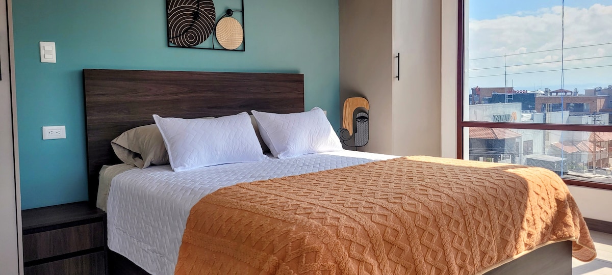Situé à Tumbaco à 18 minutes de l'aéroport, vous allez adorer notre studio, il est élégant, confortable avec une belle vue sur Quito et ses belles montagnes. Vous trouverez ce dont vous avez besoin à la fois dans la cuisine et dans la salle de bain. Il est situé au deuxième étage (il est important de mentionner que le bâtiment n'a pas d'ascenseur). Vous aurez à votre disposition un parking sécurisé. Vous pourrez visiter la zone du verger de 1 500 m² avec différents types d'arbres et le jardin avant. Bienvenue dans ce charmant petit endroit !