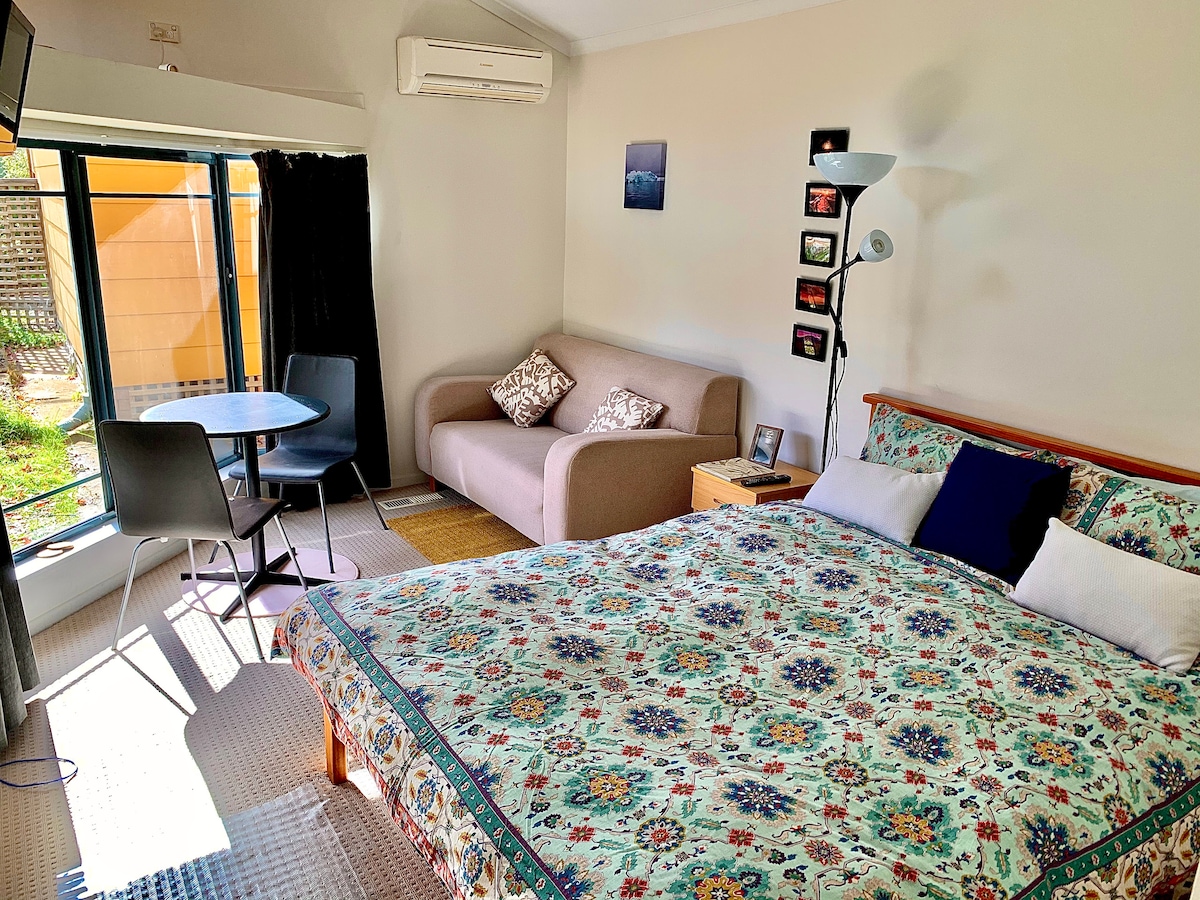 QTee convient aux courts séjours et aux voyages d'affaires. Emplacement central, proche de la ville, ANU, CSIRO, AIS, autres attractions majeures. Entrée privée, vue paisible sur le jardin, NBN (Wi-Fi FTTC). Lit queen size confortable. Salle de bain attenante de style parisien confortable. Kitchenette adaptée aux repas légers. Table et 2 chaises. Armoire. Climatisation/chauffage. Stationnement hors rue. Cadre de jardin extérieur. Non fumeur. Maximum 2 personnes. Arrêt de bus à 70 mètres. (Veuillez rechercher des annonces pour « StudioQ », une alternative de studio plus grande.)