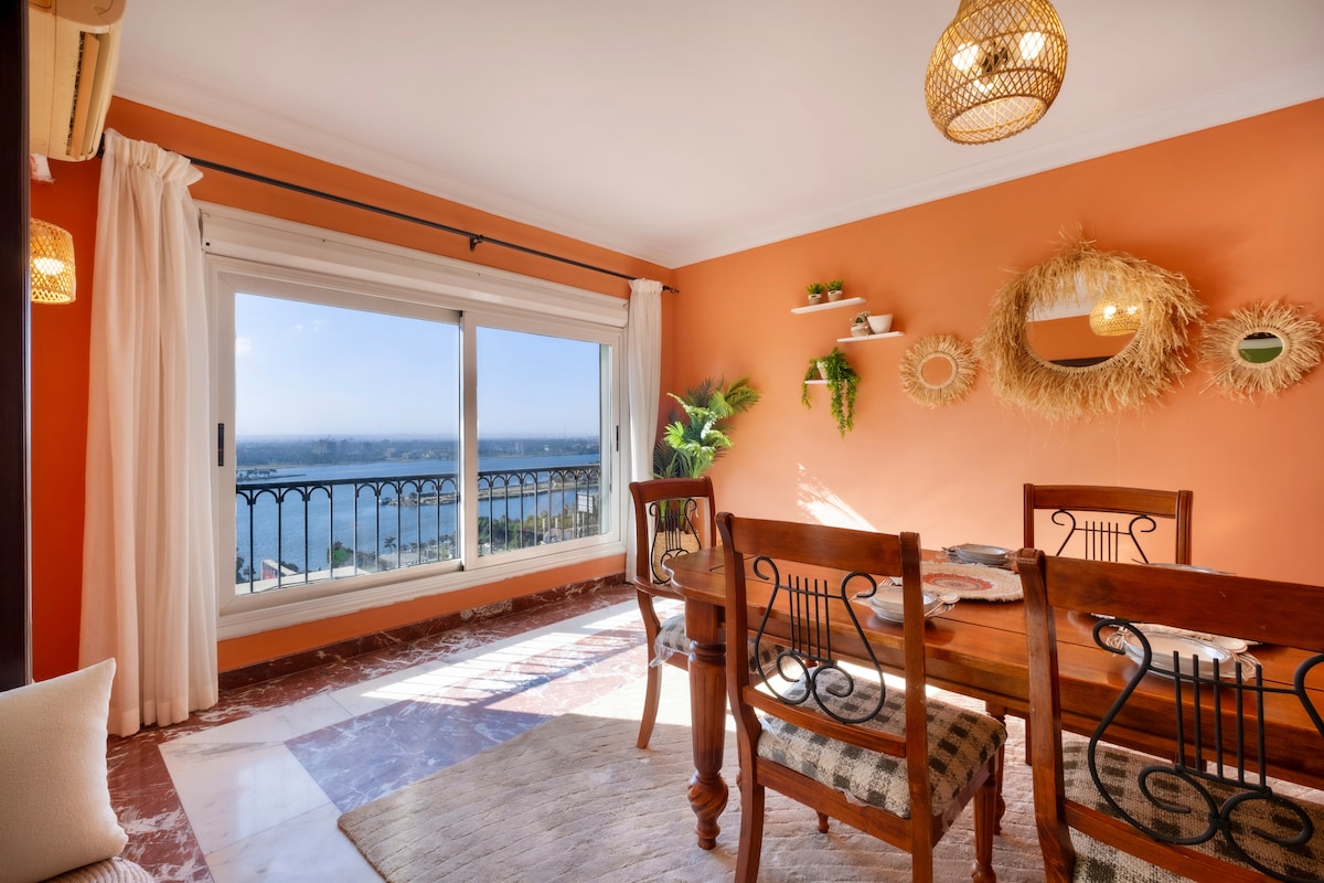 A $400 view for $75 + $100 cash back when Egypt calls you back Wake to Cairo's heartbeat-Nile & Giza Pyramid views from your balcony. Artistic 2-bedroom retreat in the middle of it all: Mona Lisa art, London & Venus wallpapers, reading nook, Netflix, WiFi, AC, stocked kitchen & Nespresso. Easy self-check-in Steps from supermarket. Minutes to felucca rides, Nile Taxi, St. Mary Church, Coptic Cairo, Civilization Museum & Pyramids Perfect for families, couples & nature lovers craving city energy