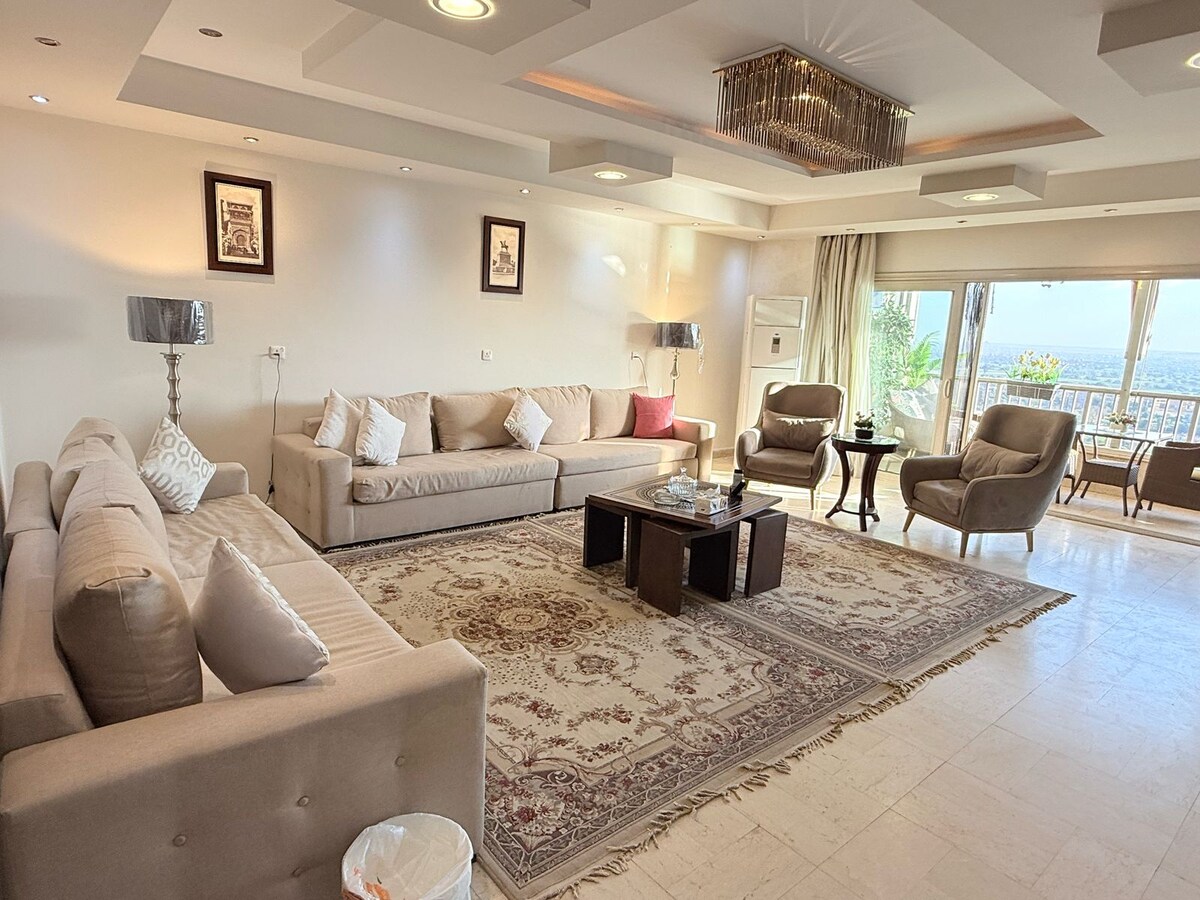 🌆 Cet appartement élégant est parfait pour les voyages en groupe ! Découvrez le luxe et la sérénité dans ce logement spacieux situé au 36e étage, offrant une vue imprenable sur la ligne d'horizon du Caire 🌃 et le majestueux Nil 🌊. Conçu avec soin, il allie charme vintage et confort moderne, idéal pour les familles, les amis 🧳 ou les professionnels 💼. Détendez-vous dans l'élégant salon 🛋️, dînez avec style 🍽️ et profitez d'une vue imprenable sur la nuit 🌙 depuis votre balcon privé 🌿 : une retraite parfaite au Caire au-dessus de la ville.