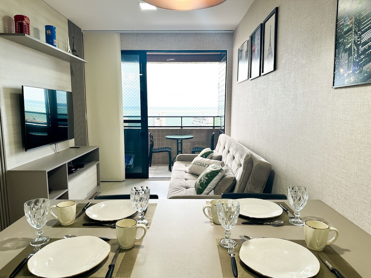 Appartement jusqu'à 4 personnes. Salon avec canapé-lit queen size, télévision par câble avec Netflix, Wi-Fi. Suite avec 1 lit double et climatisation. Linge de lit et serviettes fournis. Cuisine complète. Profitez de cet espace conçu pour transformer vos vacances à la plage en vacances de rêve ! La vue à couper le souffle, la brise qui vous apaise, unissant tout cela, tout le confort d'un appartement fonctionnel et plein de bonnes énergies ! Venez vivre cette magie, je vous attends !