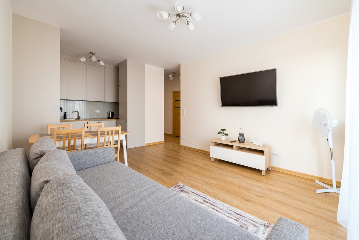 Nous vous invitons à vivre dans notre nouvel appartement, que nous avons préparé pour votre séjour confortable. L'appartement est situé dans un nouveau lotissement à la frontière du centre, décoré et équipé pour que les voyageurs puissent se sentir à l'aise ici à la fois pendant leurs vacances et leurs séjours d'affaires. Un emplacement pratique vous permet de vous rendre aux principaux endroits de Varsovie très rapidement, ainsi que d'accéder facilement à l'aéroport et aux gares de la capitale en 10 minutes.