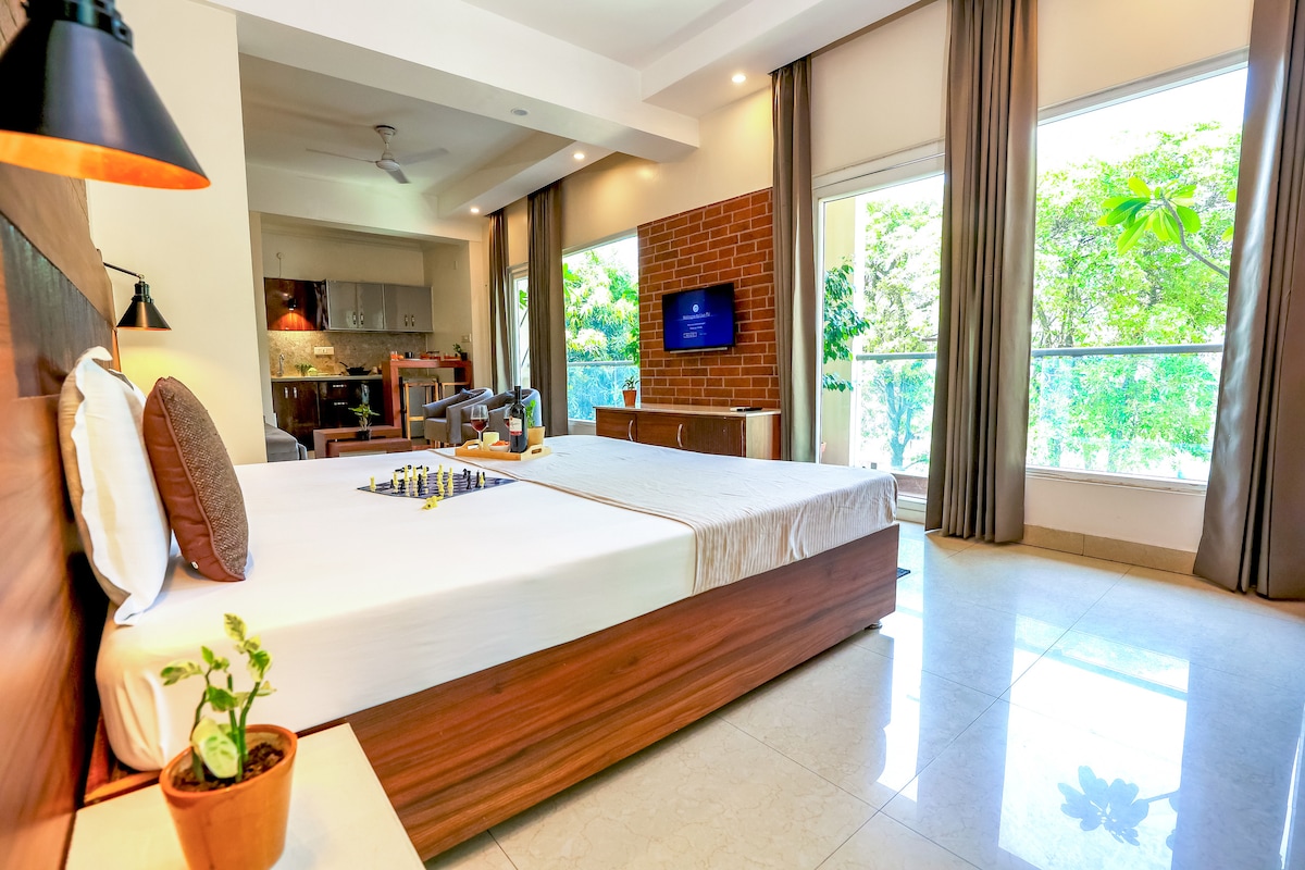♂Installez-vous dans le confort d'un studio élégamment conçu, encore plus grand que n'importe quelle chambre d'hôtel, avec l'avantage de sa propre cuisine, au cœur de Gomtinagar. Ce studio moderne au 2e étage est idéal pour 4 personnes. Ses grandes baies vitrées et ses balcons en verre s'ouvrent sur la verdure et l'agitation autour de la propriété. Les centres commerciaux, les supermarchés, les restaurants, les magasins, les blanchisseries, etc. sont à distance de marche de cet endroit, pour votre commodité.
