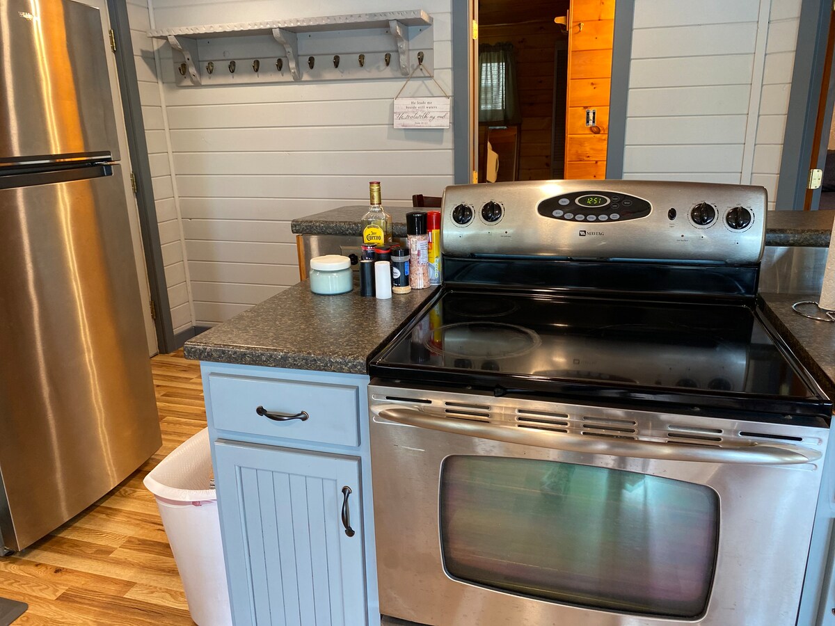 L'étage principal dispose d'un salon, d'une cuisine et d'un coin repas, d'un lit Queen Size, avec un lit de jour et un lit gigogne. Le loft dispose de 2 lits jumeaux. Le canapé peut servir de lit, salle de bain complète. N'a pas d'évier de cuisine mais dispose d'un coin cuisine avec micro-ondes, grand four à air, réfrigérateur-congélateur, grille-pain et cafetière, fer et planche à repasser. Il y a également une télévision, un lecteur DVD/Blue Ray, un barbecue au gaz (de mai au 1er novembre), ainsi qu'une table de pique-nique et un foyer extérieur. Pour les voyageurs qui voyagent en avion, des serviettes sont fournies, sur demande.