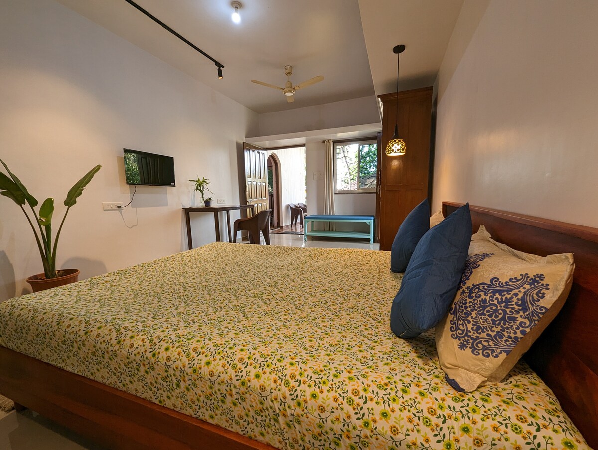 Ce studio est situé au nord de Goa. La chambre dispose d'un lit Queen Size confortable. Nous disposons d'une salle d'eau privée et propre avec eau courante chaude ou froide. Il y a une cuisine avec des ustensiles que vous pouvez utiliser pour préparer des repas. Nous fournissons une connexion Wi-Fi gratuite à tous nos voyageurs qui souhaitent travailler ici pendant leurs vacances. Nous avons également une télévision intelligente pour votre divertissement. Vous pouvez cliquer sur Contacter l'hôte pour me demander quoi que ce soit avant de réserver.