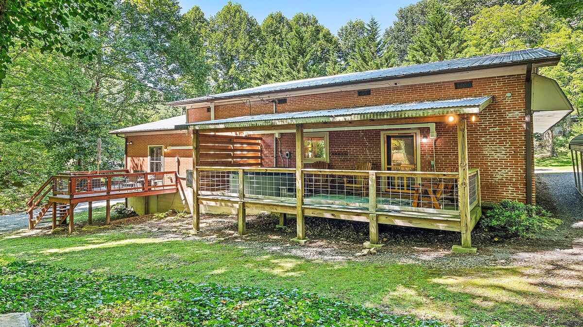 Le milieu du siècle rencontre un refuge de montagne. Les vues panoramiques sur la montagne et le terrain de golf donnent à cette magnifique maison une sensation de luxe. Cette maison se trouve à un mile du Maggie Valley Country Club (golf et restaurant ouverts au public), des ruisseaux de truites et des sentiers de randonnée. Que vous soyez un passionné de plein air qui cherche à skier à Cataloochee, à faire une excursion d'une journée à Asheville pour profiter des brasseries, à Cherokee pour visiter le Casino ou à conduire sur la Blue Ridge Parkway, c'est l'escapade ultime. Peut accueillir 6 personnes avec plus de 1500 pieds carrés de terrasse extérieure !